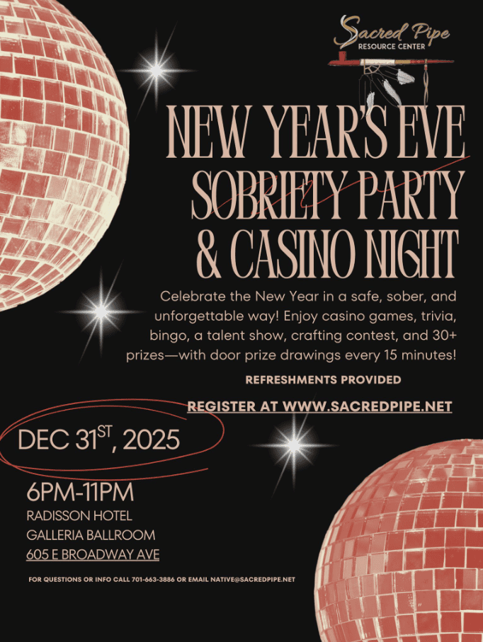 Sacred Pipe Resource Center 925 Basin Ave Suite 2, Bismarck, ND, United StatesRegister for the Event here! https://www.sacredpipe.net/new-years-eve-party/ Or email us at native@sacredpipe.net