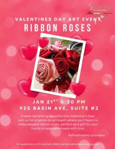 Our art event this month is a great project, making ribbon roses. All supplies are provided in a variety of colors. Make a great gift for your loved one(s)!